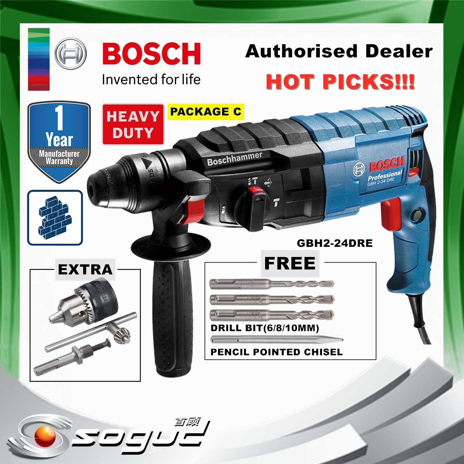BOSCH GBH224DRE PROFESSIONAL ROTARY HAMMER (GBH 2 24 DRE) Shopee